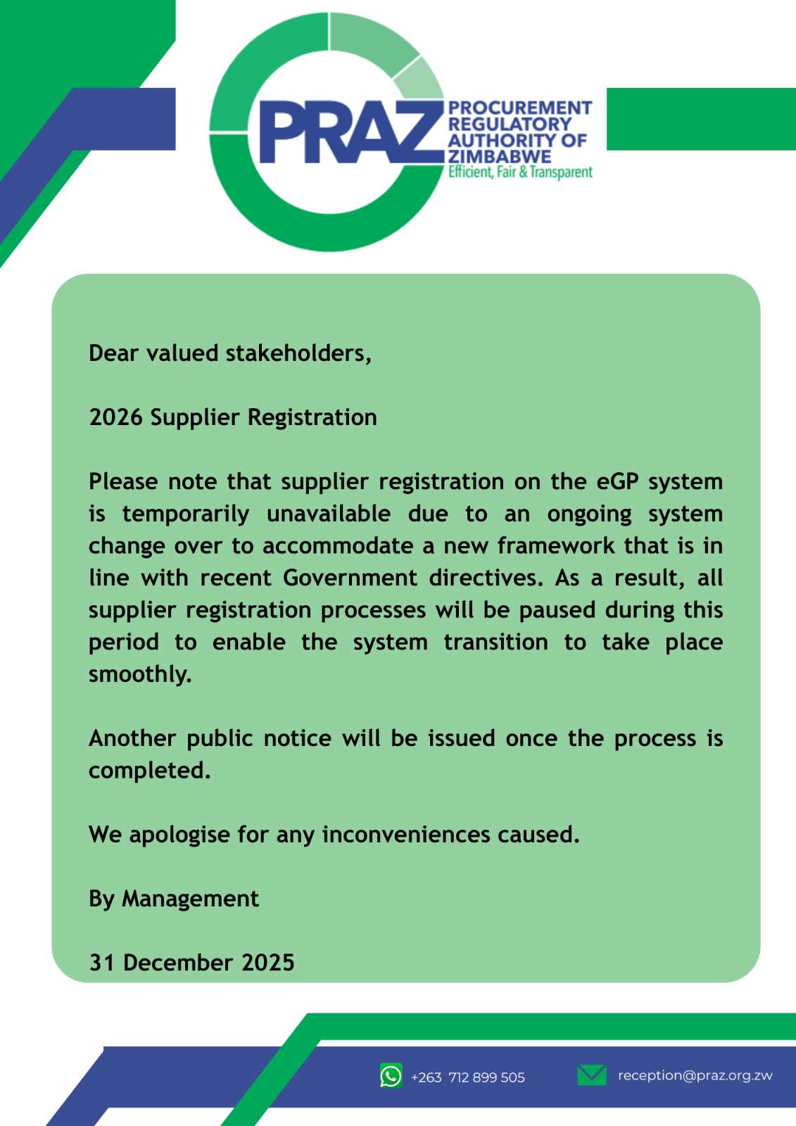 Please be advised that supplier registration on the eGP system is currently unavailable due to an ongoing system upgrade. This upgrade is intended to accommodate a new framework aligned with recent Government directives.
